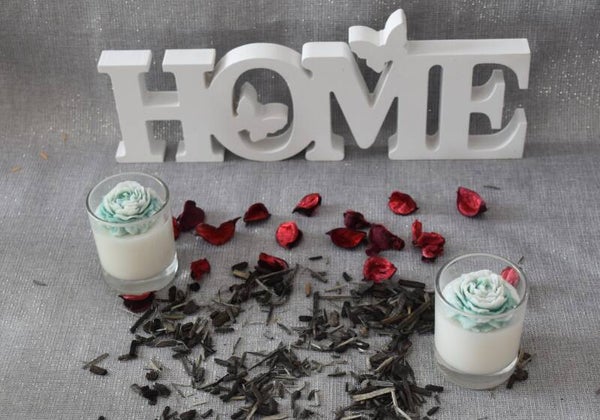 Cire végétale coulée avec des parfums de Grasse. Utilisation de mèches en coton naturelles, tressées et cirées.